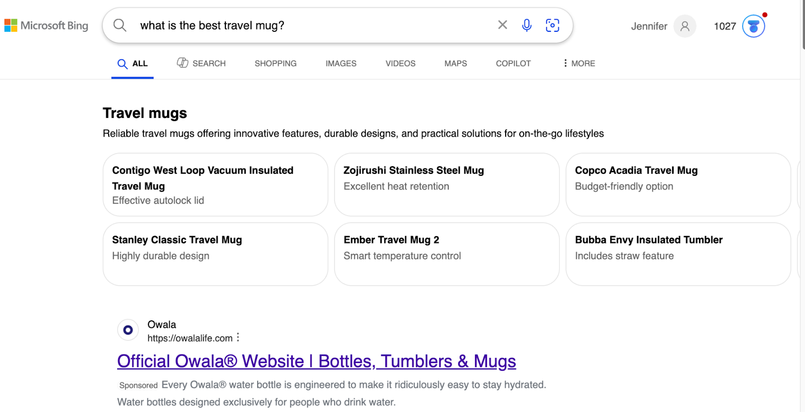 Back to testing search, I also asked my question about travel mugs using Microsoft Edge running CoPilot. If you’ve used Edge, you know that you can set default to “All” much like how Google presents results. This is the setting that is not running CoPilot. See those results here.