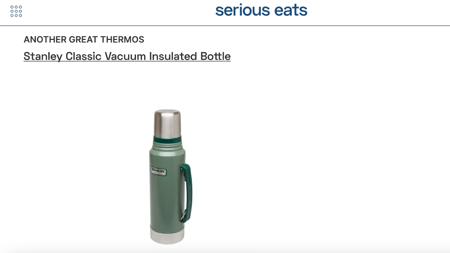 Case in point: this is screen grab from a Serious Eats page with the subheading of “Another Great Thermos” only it shows a Stanley product. This is how establish brands lose market share and how newer brands land move into that yawning space.